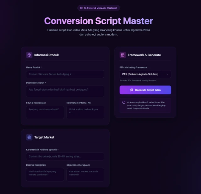 Gak perlu bayar developer jutaan. Gak perlu skill coding. Tinggal isi form → klik generate → landing page profesional langsung jadi. Siap dipasang iklan, siap closing.